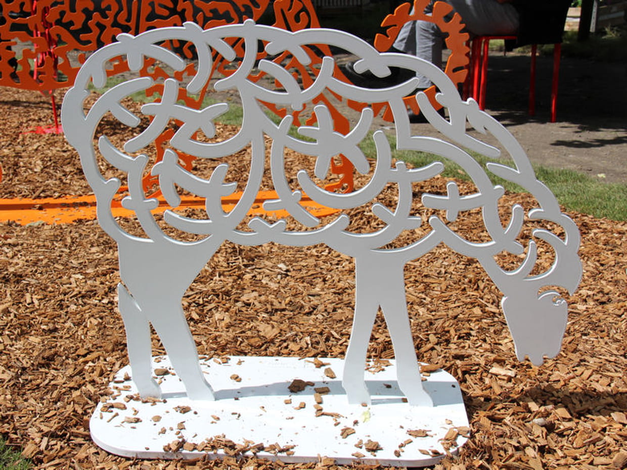 Danu est un artiste qui vit et travaille à Vence (Alpes-Maritimes). Il crée des sculptures silhouettes, inspirées de la figure féminine mais aussi, comme ici, des animaux. Celles-ci sont découpées au laser dans d'épaisses plaques d'acier ou d'aluminium, qui sont ensuite grenaillées et recouvertes de plusieurs couches de protection et de peinture. Petit coup de coeur pour ce mouton immaculé qui ne demande qu'à paître tranquillement dans un jardin.