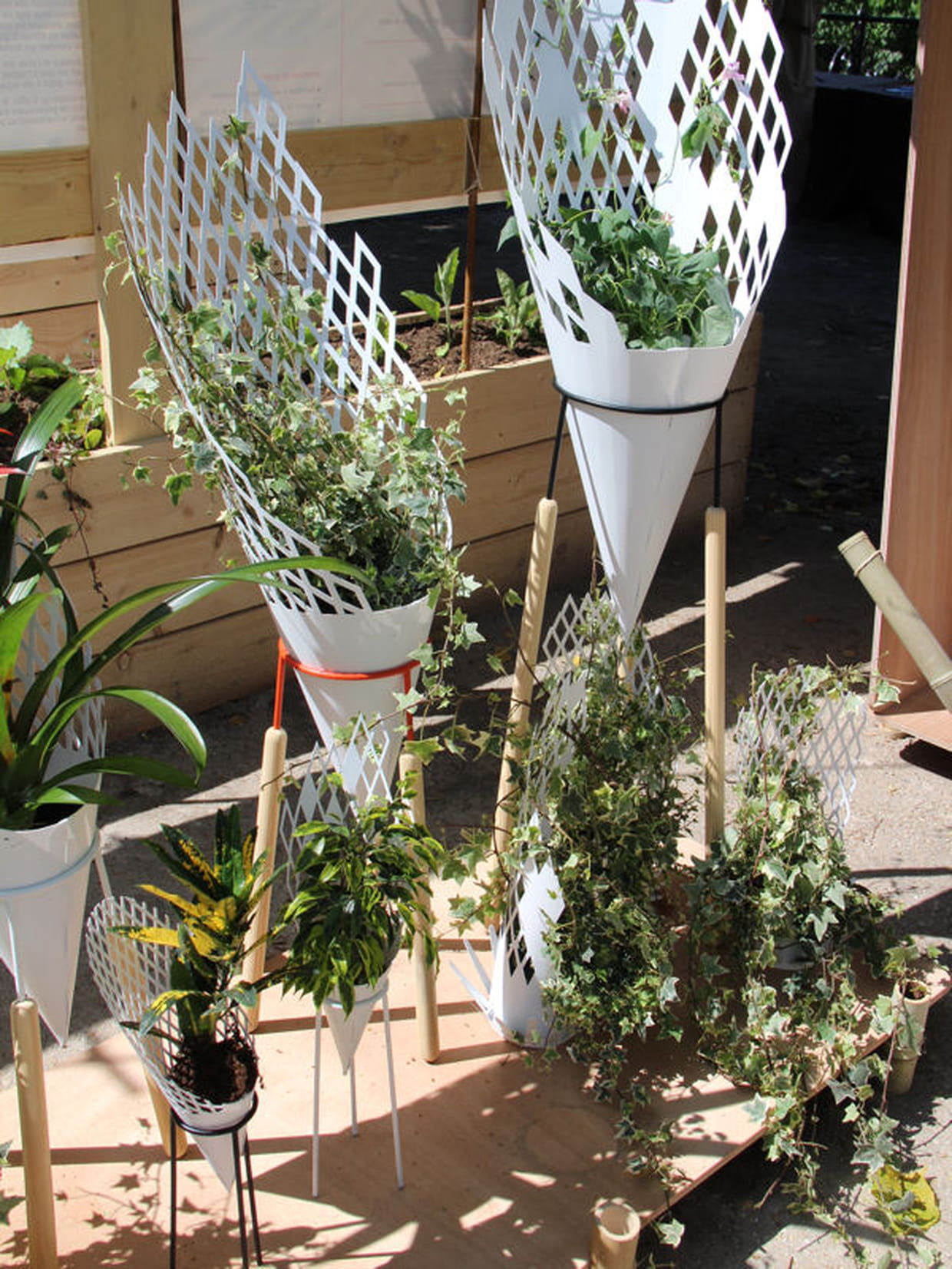 Conçus par les designers de l'Atelier Phorbe, Joris Christolomme et Maxime Duché, ces contenants Horn et Iugatam au look très moderne combinent la forme d'une corne d'abondance et le treillage. Ils permettent ainsi une mise en valeur d'une plante grimpante. En polypropylène, ils peuvent recevoir directement la terre avec la plante : nul besoin de laisser le fameux pot en plastique.