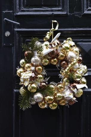 Faut qu'ça brille ! Pour les fêtes, la porte d'entrée se pare de mille feux doré, cuivré et argenté, avec cette couronne de Noël composée de plusieurs boules.