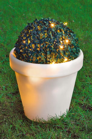 Le jardin ou le balcon prennent des airs chics avec cette composition topiaire de faux buis agrémenté de petites LEDs.