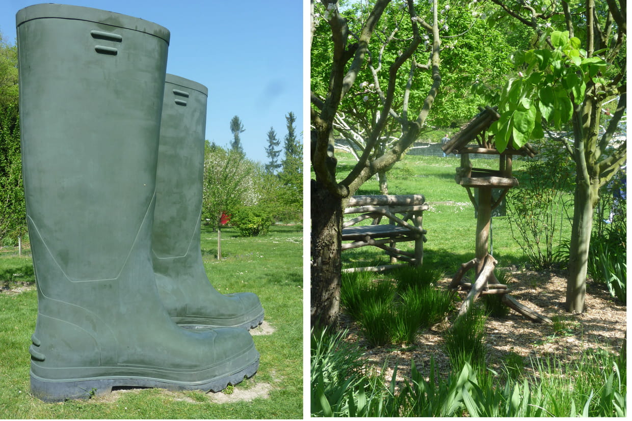 Au château, tout appelle à la rêverie et à la réflexion, qu'il s'agisse de l'arbre transfomé en nichoir ou de ces bottes de géants (deux pieds gauches !) de l'artiste Lilian Bourgeat (Invendus-Bottes, 2006).