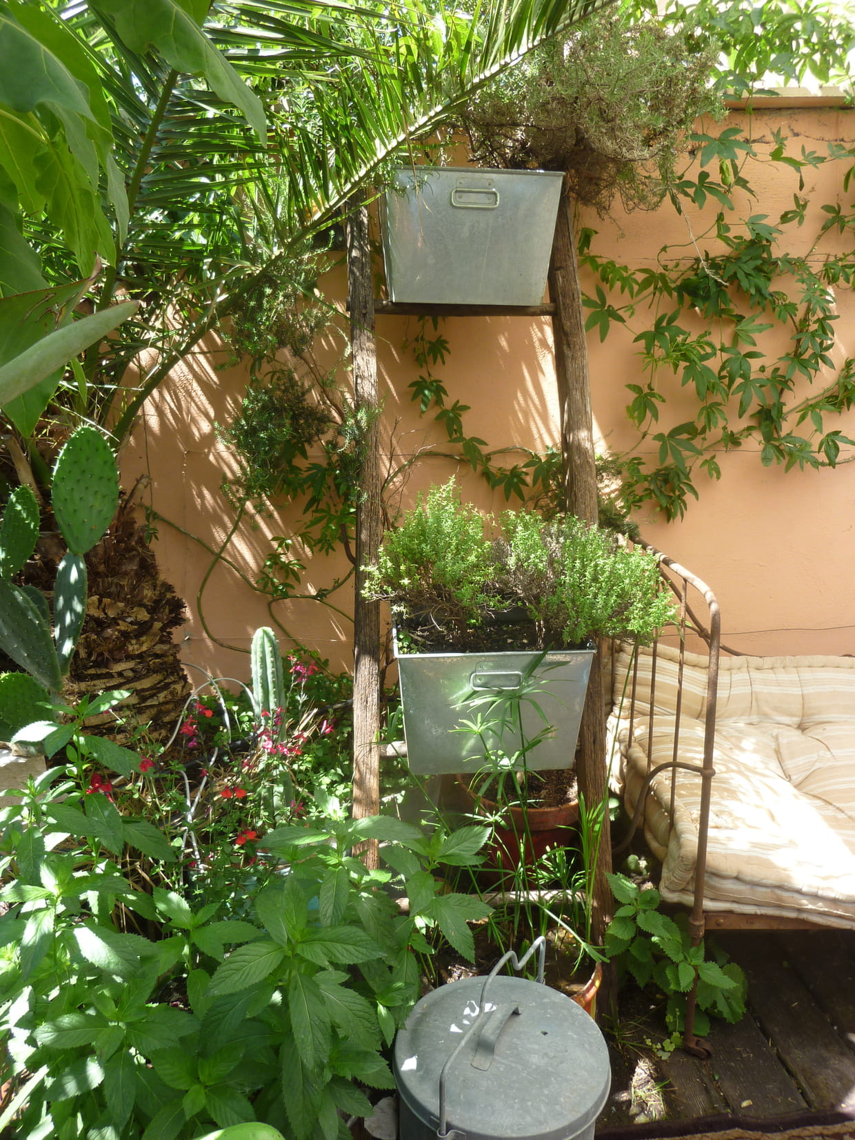Sortez la grande échelle ! Elle fera une jolie étagère où entreposer vos jardinières. Veillez à la traiter selon sa composition (bois ou métal) afin qu'elle ne souffre pas des intempéries, surtout si elle n'est pas abritée.