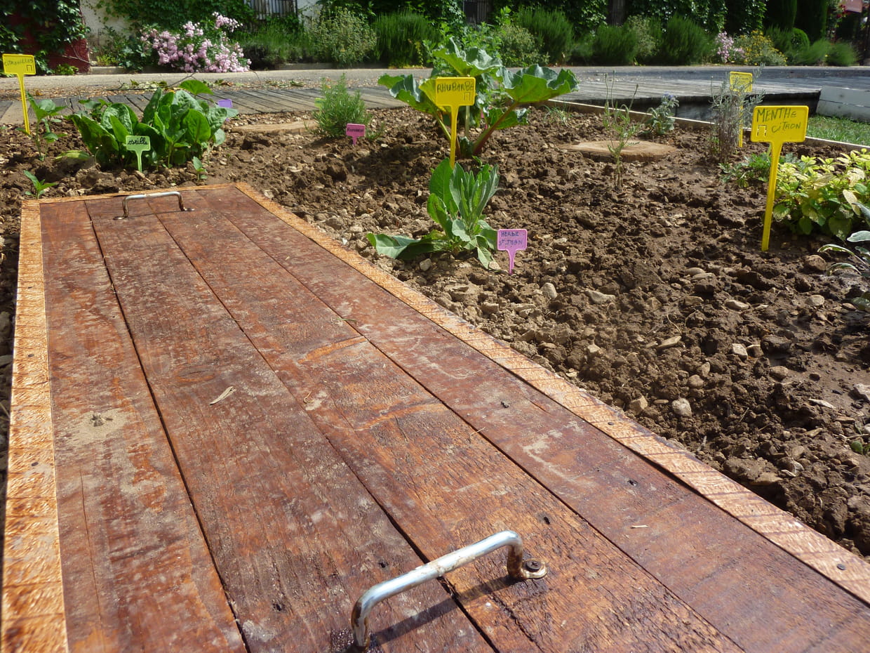 Pour circuler dans votre potager sans risquer d'abîmer vos plantations, imaginez un chemin. Celui-ci est fait d'une vieille porte en bois.