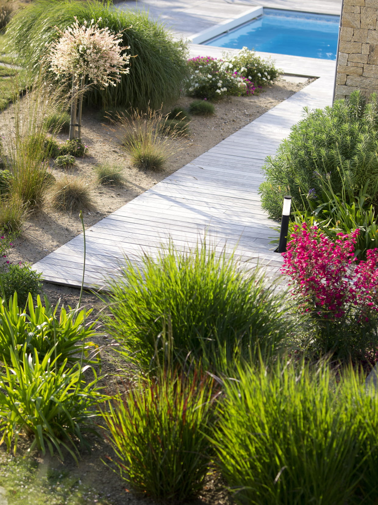 La propriété bénéficie d'une piscine dont le décor a été pensé comme une dune de bord de mer, avec un plancher en ipé et un massif paillé de sable et planté de graminées, d'un Salix integra hakuro-nishikiali en demi-tige, d'un Koeleria glauca et d'un rosier des Pyrénées.