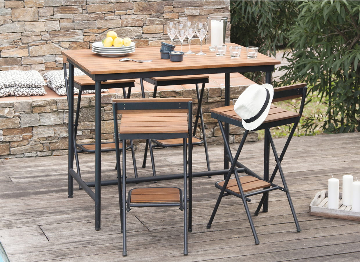 Prenons de la hauteur avec Cellar, un salon de jardin gain de place en acacia rappelant l'esthétique du bar. Salon de jardin Cellar comprenant une table haute et 4 tabourets : 499 euros, chez Delamaison.fr.