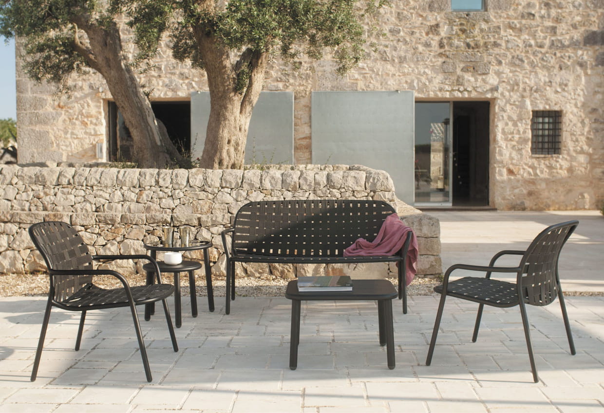 Très ergonomique, l'assise tressée de bandes élastiques du salon de jardin imaginé par Stefan Diez pour Emu épouse parfaitement les formes. Prix : 615 euros la banquette et 255 euros le fauteuil, chez Emu.