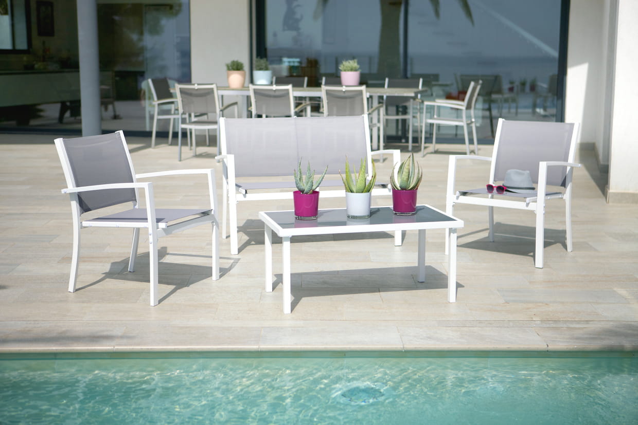 Epurée à souhait, l'esthétique de la nouvelle collection de salon de jardin Eleganza séduit au premier coup d'oeil. Salon de jardin Eleganza : prix sur demande, chez les Magasins U.