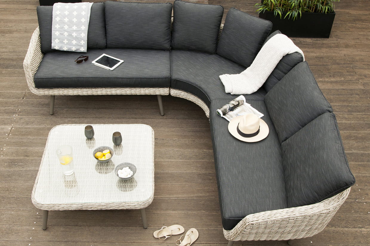 Ce salon de jardin en rotin synthétique est modulable selon les envies. Ici, il est présenté dans sa version deux canapés, un d'angle et une table basse. Prix : 1 299 euros - Où l'acheter ? www.delamaison.fr