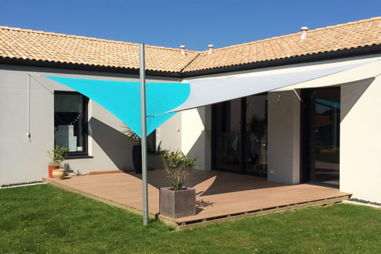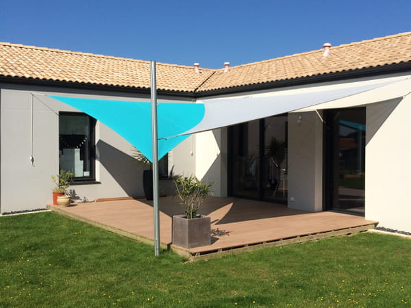 Les textiles utilisés sont entièrement recyclables et garantis 5 ans contre la décoloration. Tel un bouclier thermique, la toile micro-aérée laisse passer l'air et l'eau pour éviter toute surchauffe sous le voile d'ombrage, mais filtre 80 % des UV des rayons du soleil : protection et fraîcheur assurées donc. Fabriquées selon les mêmes procédés que les voiles nautiques, dans une voilerie de Loire-Atlantique, ces toiles d'ombrage se fixent entre la façade de la maison et un mât à l'aide d'anneaux en inox, ce qui permet à l'installation de résister à des rafales de vent de 80 km/h. Elles sont également réglables et inclinables le long du mât en fonction de la position du soleil. Pour rester protégé du soleil à n'importe quel moment de la journée.