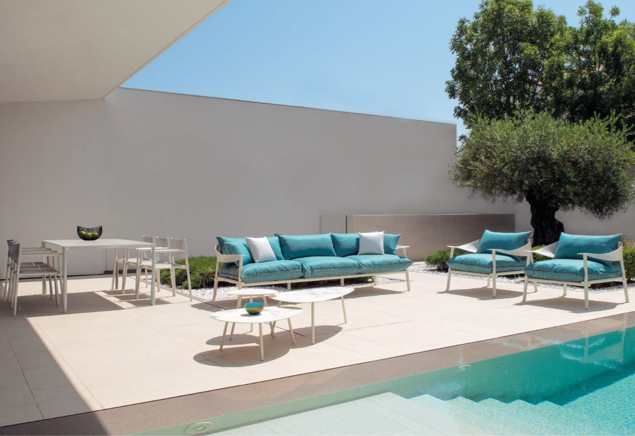 Salon de jardin en aluminium avec coussins à mémoire de forme, par Chiaramonte Marin pour EMU. Prix : 3285 euros le sofa trois places et 1455 euros la chauffeuse. Où l'acheter ? www.rbcmobilier.com