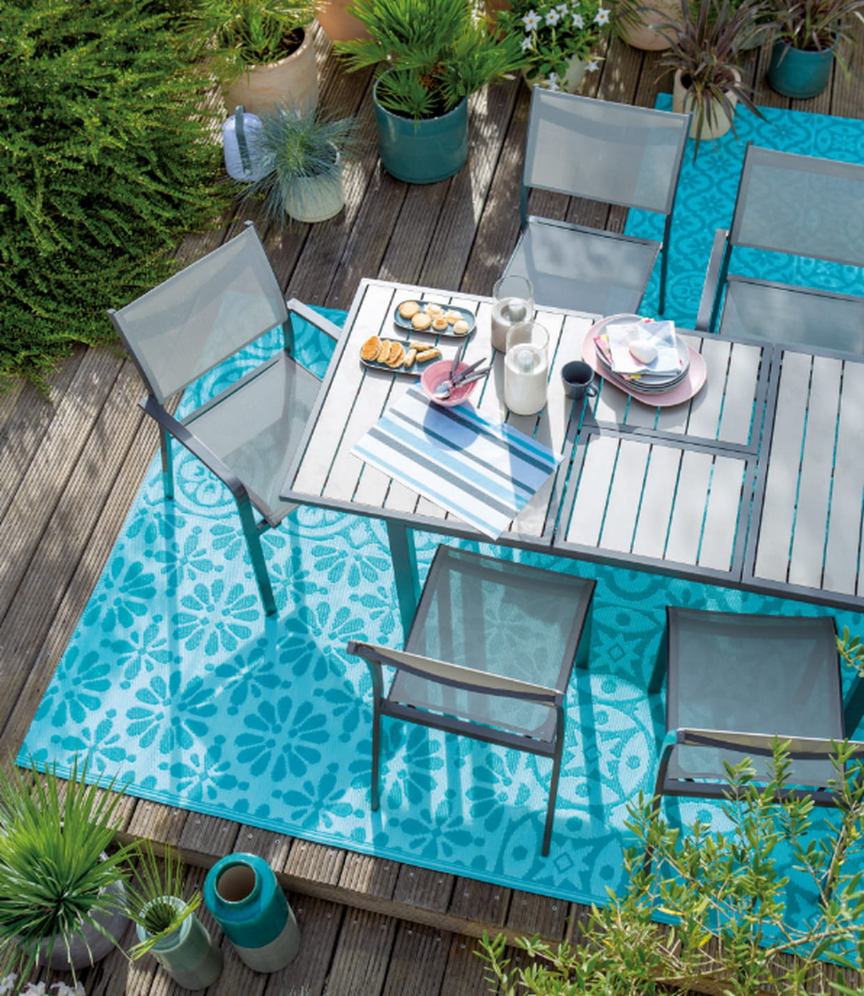 Tapis motif floral bleu de Jardiland, en polypropylène. Disponible en 182 x 120 cm ou en 270 x 180 cm. Prix : 29,90 euros le petit modèle et 59,90 euros le grand. Où l'acheter ? www.jardiland.com