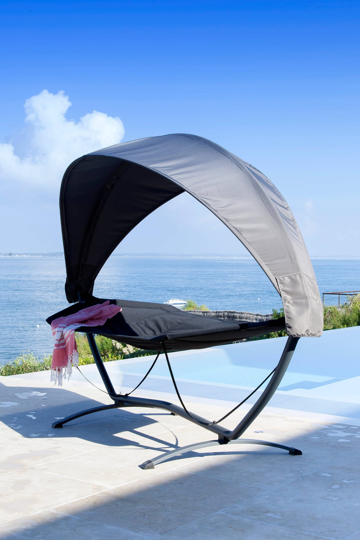Hamac Serena de ProLoisirs avec ombrelle. Produit avec structure en acier cataphorèse et peinture époxy grise/noire. Couchage et voile d'ombrage en polyester, coloris taupe. En vente chez les revendeurs spécialisés et jardineries. Prix : 249 euros en moyenne. Où l'acheter ? www.proloisirs.fr