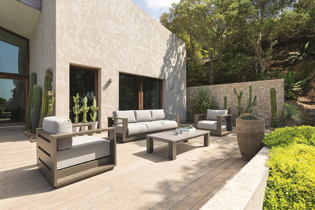 Salon de jardin Héraklion en aluminium traité époxy et polyester, composé d'un canapé 3 places, L 230,5 x P 85 x H 65 cm, de deux fauteuils L 95,5 x P 85 x H 65 cm. et d'une table basse L 140 x P 72 x H 36 cm. 1 999 euros chez Hespéride