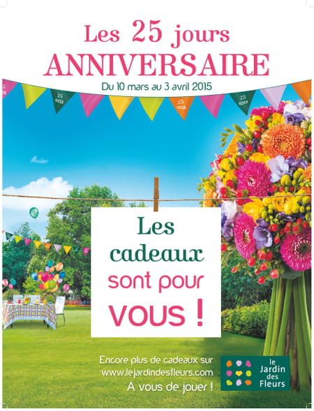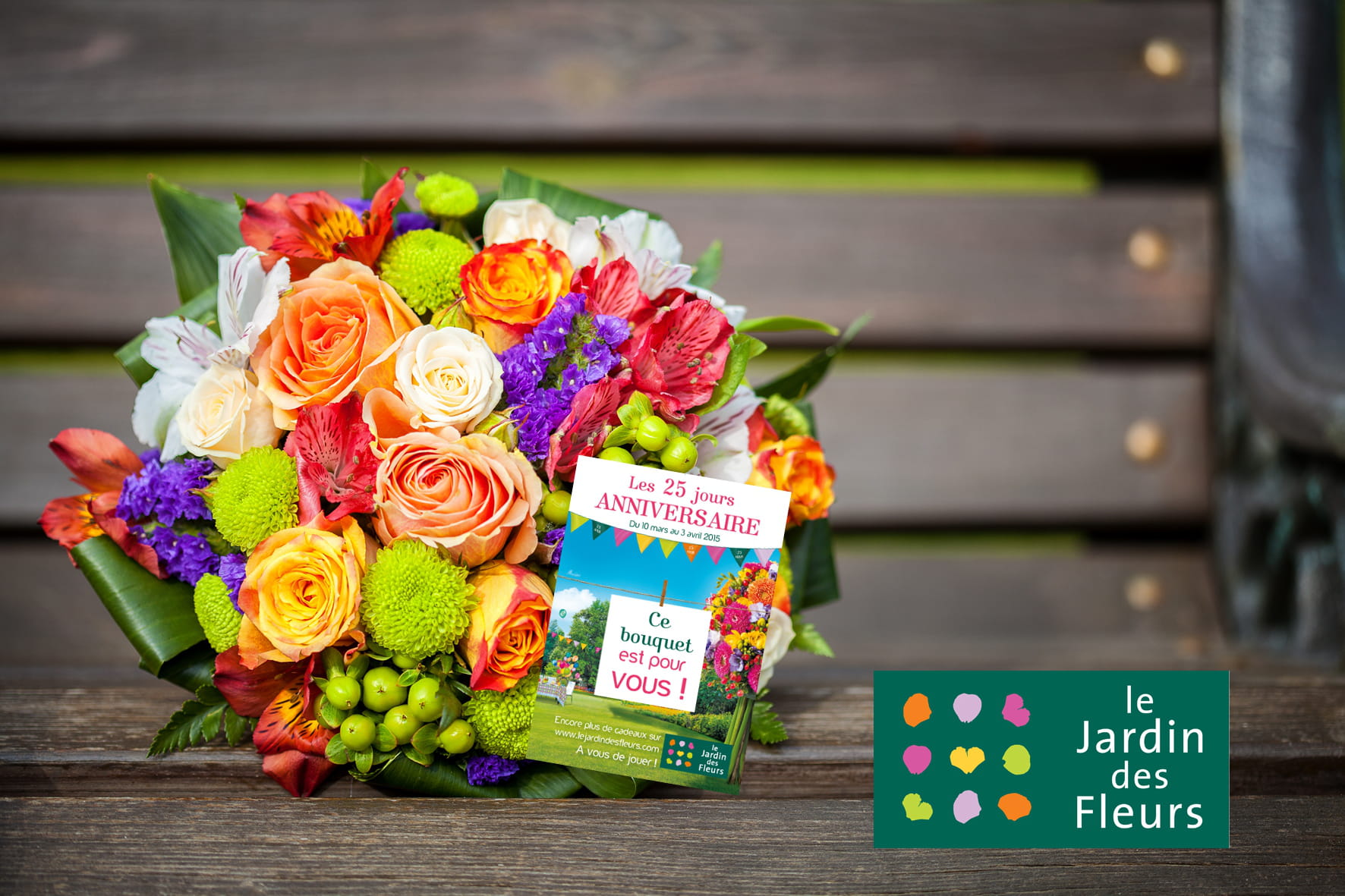 25 jours de fête et de cadeaux surprises, c’est ce que réserve l’enseigne Le Jardin des Fleurs du 10 mars au 3 avril 2015 pour ses 25 ans. Des bouquets surprise cachés dans la rue, des achats doublés, des coupons de réduction, des jeux bingo sur Internet… Tout un florilège d’opérations pour marquer le coup ! Alors ne vous étonnez pas, si d'aventure votre chemin croisait celui d'un bouquet de fleurs, posé ici ou là à travers la ville ; il s'agit en fait d'une délicate attention des fleuristes de l'enseigne qui vous offrent ce joli bouquet. Cette opération débute aujourd'hui et se déroulera pendant 25 jours à travers 54 villes de France. Avec toutes ces attentions, Le Jardin des Fleurs souhaite juste faire plaisir à ceux qui auront la chance de dénicher un des 1 350 bouquets cachés à travers la France. En plus de cela, durant toute la période de l'opération, dans les 74 magasins du réseau et sur le site de e-commerce de l’enseigne, de nombreux jeux de grattage, des bons de réduction, des roses offertes… seront également disponibles.