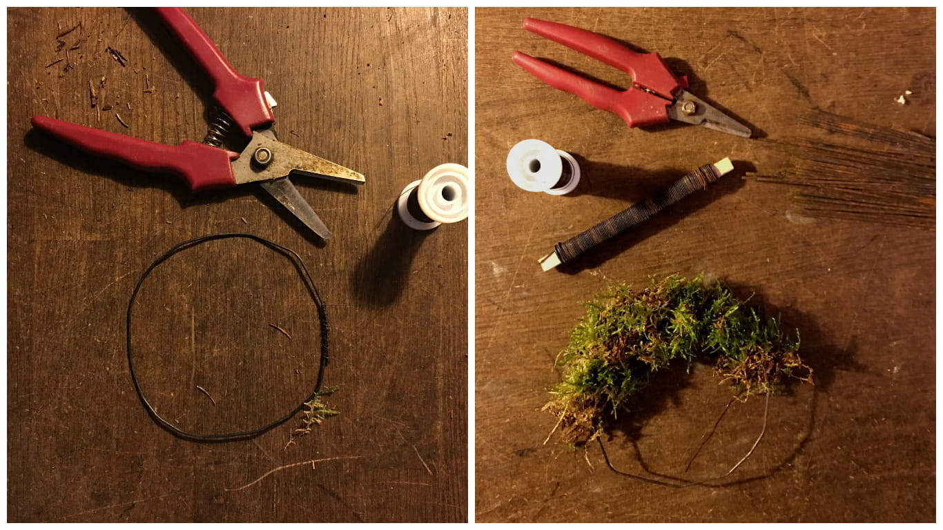 Prenez les baguettes métalliques et enroulez-les pour créer des cercles. Utilisez le fil de fer pour maintenir les deux extrémités du cercle. Il est possible, avec deux baguettes, de faire une base avec un diamètre plus grand. Recouvrez ensuite les cercles avec de la mousse que vous faites tenir grâce au fil de fer enroulé tout autour du cercle. Opération à répéter trois fois.