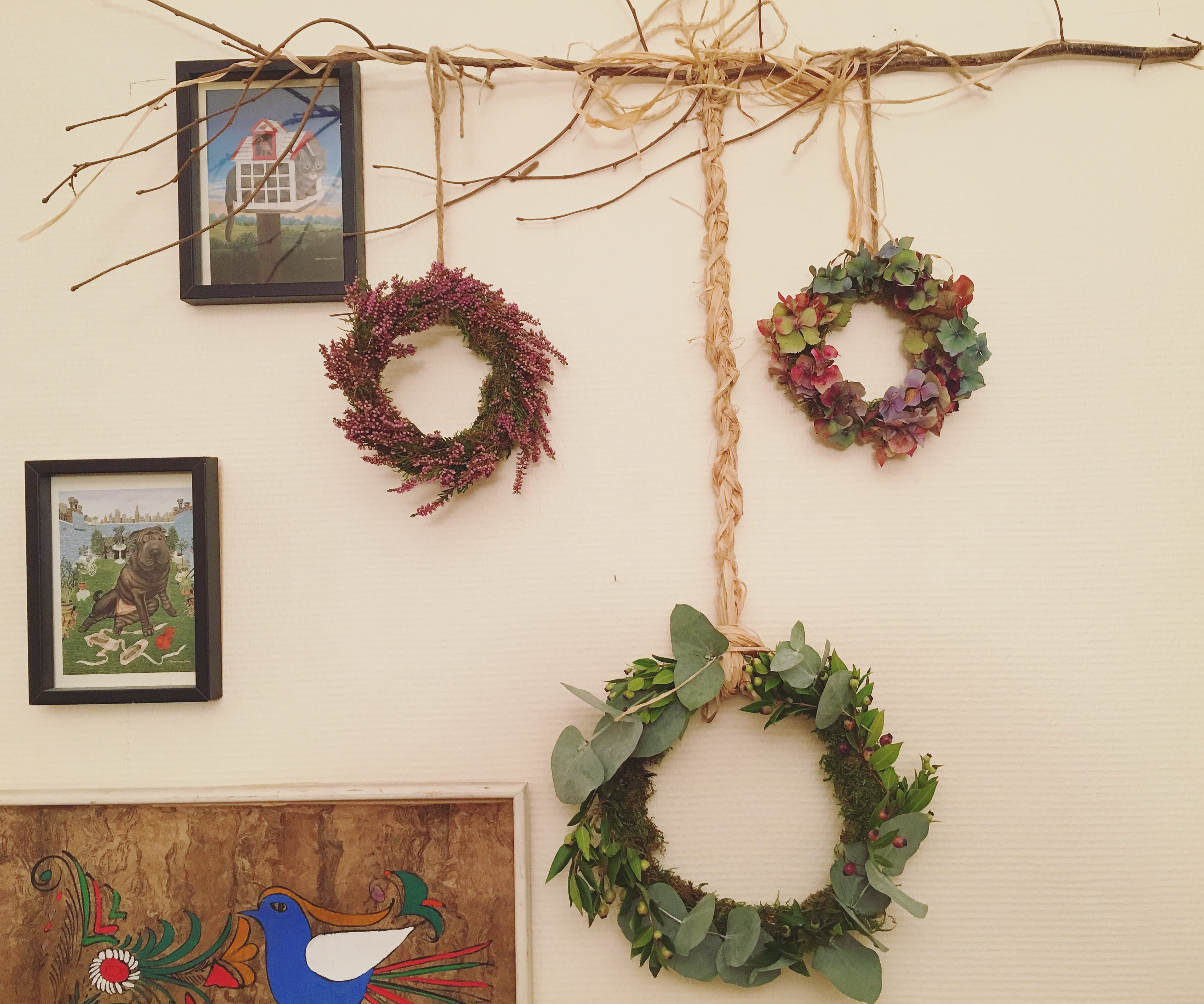Bruyère, hortensias, myrte et eucalyptus se rencontrent dans cette composition sous forme d'un triptyque de couronnes à réaliser soi-même.