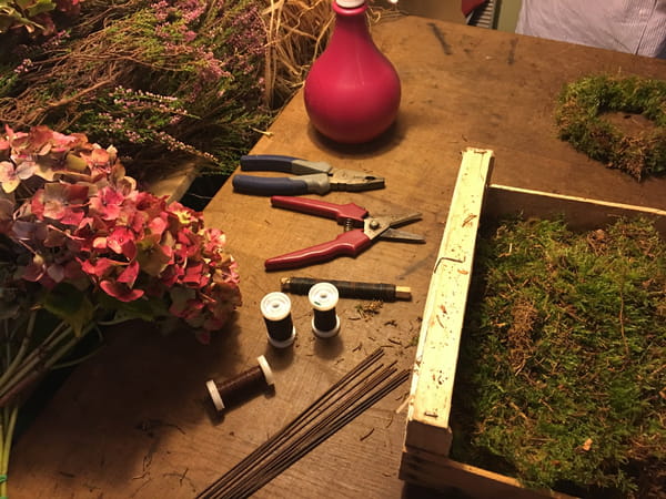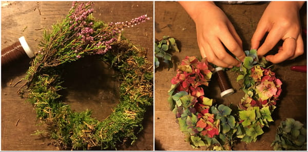 Au sécateur, coupez des petites tiges d'hortensia, de bruyère, de myrte et d'eucalyptus. Installez les tiges sur la couronne et maintenez-les avec le fil de fer que vous enroulez autour de la couronne. Pensez à serrer le fil de fer pour que les plantes tiennent bien sur la mousse. Ici, ont été réalisées une couronne avec de l'hortensia, une avec de la bruyère et une dernière avec une succession de brins d'eucalyptus et de myrte.