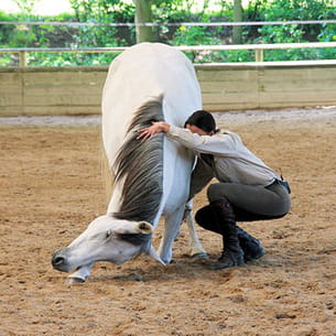 Pas à pas, Emilie guide son cheval et lui indique la marche à suivre pour se coucher sans se faire mal.