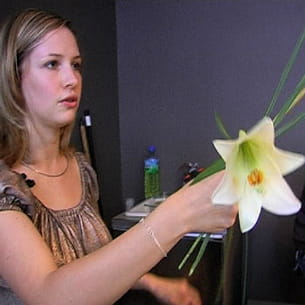 Pour commencer, prendre les herbes sauvages. On donne le ton de l'arrangement avec un lys arysis en évitant par la suite de trop mélanger les éléments de façon à bien les distinguer dans le bouquet.