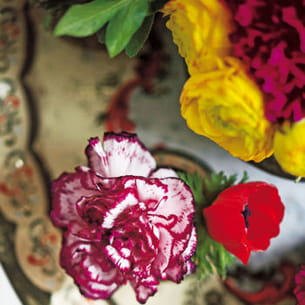 Jaune, cramoisi, écarlate, cerise... Les tons vifs et contrastés de ces fleurs rappellent l'exotisme de l'Inde. Naturelles ou figurées sur les tissus et céramiques, les fleurs sont ici la principale source de couleur.  Les tables, étagères et plateaux qui les accueillent s'apparentent à des autels chargés d'offrandes. Têtes d'œillets carmin et pétales de roses réunis dans un bol tibétain, pois de senteur dressé dans une tasse, renoncules jaunes et œillets roses serrés dans une coupe, les compositions les plus simples sont souvent les plus saisissantes.