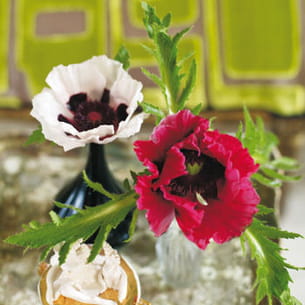 Les fleurs délicates peuvent perdre de leur prestance auprès de motifs très marqués, mais les pavots d'Orient et les pivoines s'en sortent admirablement à côté de ces audacieux imprimés rétro. Décorer une pièce avec des arrangements de fleurs des jardins revient à y faire entrer un peu du caractère sauvage et généreux de la nature. Ainsi, les pavots nous enchantent tout au long de leur floraison, bouton charnu et duveteux, qui s'ouvre pour dévoiler des pétales froissés et ondulés, au cœur sculptural, et qui demeure hérissé d'étamines une fois les pétales tombés.