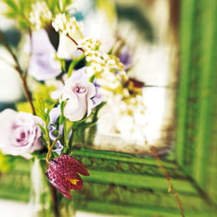 Imitant l'ensemble hétéroclite formé par les tissus d'ameublement anciens et les cadres accrochés au-dessus de la cheminée, les fleurs de cette chambre affichent une combinaison de couleurs peu commune, mêlant les mauves sourds, le blanc pur et le vert lime rafraîchissant. Arrangés en bouquets asymétriques et clairsemés sur la tablette de la cheminée ou isolées dans de tout petits vases transparents, les fleurs emblématiques de l'ère victorienne que sont la rose, la pensée, la fritillaire et le muguet, dévoilent une indéniable contemporanéité.