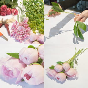 La préparation des fleurs se terminent avec les poids de senteur et les pivoines. Les premières n'exigent aucune manipulation particulière car elles ne possèdent ni feuilles ni épines. Les pivoines sont de préférences choisies de manière à avoir des boutons fermés et ouverts pour une plus longue durée du bouquet.
