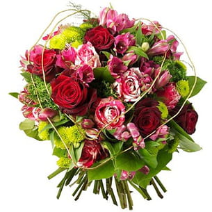 Le bouquet Amour charmera votre dulcinée. Là encore, les roses tiennent une place essentielle dans cette composition florale. Ces dernières se mêlent parfaitement aux lis du Pérou ou lis des Incas, connus également sous le nom d'Alstroemeria ainsi qu'aux santinis. Le tout est accompagné de feuillages divers et d'un élément décoratif en forme de coeur posé au dessus du bouquet.