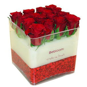 Las des bouquets ronds ? Optez pour une composition piquée originale. Ce cube, rempli de roses rouges, offre une décoration fleurie moderne. Graviers, mousses et roses se répartissent sur 3 étages pour donner un côté chic à ce bouquet.