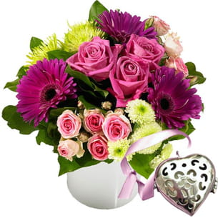 Les fleurs, on a toujours plaisir à en recevoir comme à en offrir. A l'occasion de la fête des amoureux, que diriez-vous d'y associer un petit présent en plus ? Entre les roses gros boutons et petits boutons, les gerberas couleur fuchsia, les santinis et l'élégant feuillage vert qui encadre le tout, dissimulez-y un pendentif en forme de coeur. Ce dernier, suspendu par un ruban, diffuse également une agréable odeur de fleur de rose qui prolongera le plaisir des sens bien après le 14 février.