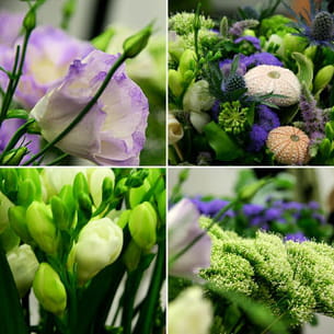 Le bleu de l'ageratum et des chardons assemblé avec le blanc pur des freesias et du trachelium apportera la touche nécessaire pour créer une ambiance de vacances.