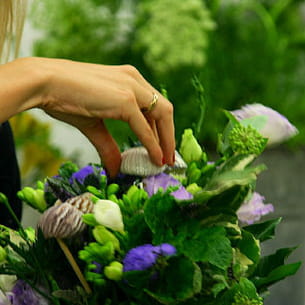 Afin d'amplifier la touche "vacances" de ce bouquet rond bord de mer, n'hésitez pas à y inclure des coquillages ramassés cet été, en les collant sur des baguettes en poids.
