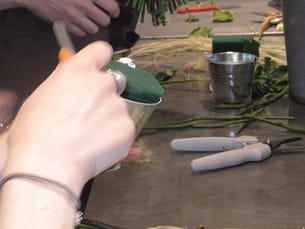 Prenez le petit seau en zinc et coupez les bords de la mousse synthétique pour fleurs afin de pouvoir la faire rentrer dans le seau. © Laetitia Devillars / Journal des Femmes