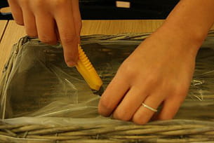 Prenez votre contenant. Pour notre part, nous en avons choisi un en osier mais vous pouvez tout à fait opter pour un autre style. Si comme le nôtre, il y a du plastique à l'intérieur, faites des trous avec un couteau ou un cutter pour permettre l'évacuation de l'eau.
