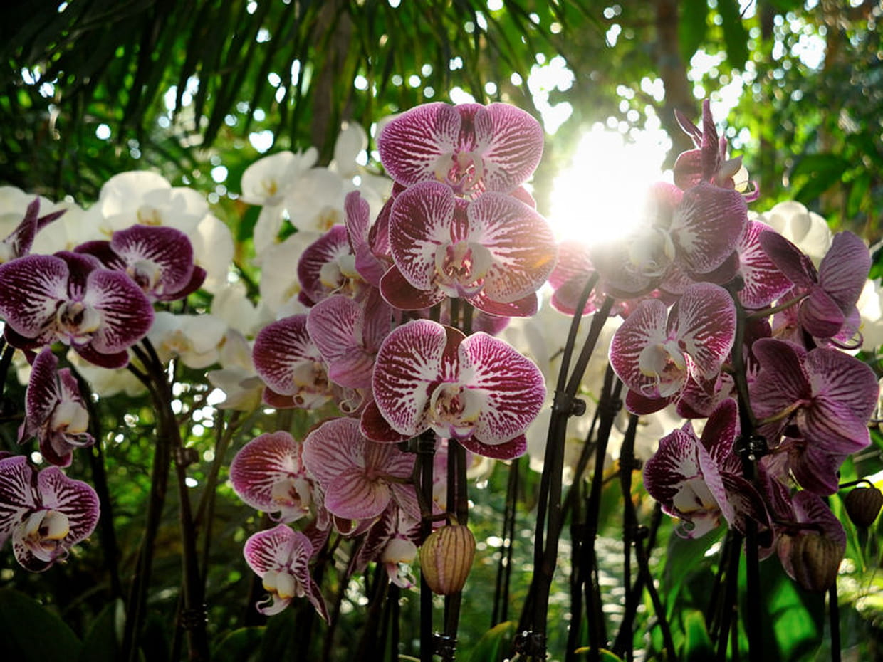 La "forêt" d'orchidées blanches côtoie ici une série plus colorée aux pétales striés de blanc et violet.