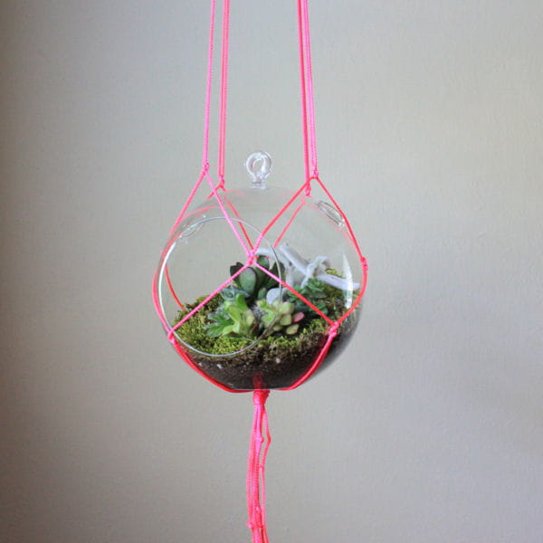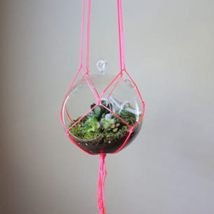 Ce fil de nylon rose fluo, noué en macramé, sert à suspendre un mini terrarium en forme de boule. Idéal pour dynamiser un bureau un peu terne, par exemple.