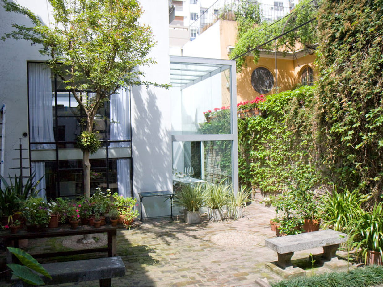 Les modules très géométriques et modernes de cette habitation se fondent à merveille dans une végétation bien présente, sans être envahissante. Quelques petites plantes mettent une touche de couleur bienvenue. Mais c'est surtout la vigne vierge qui crée un décor végétal comme un cocon, encadrant avec douceur la maison et sa terrasse.
