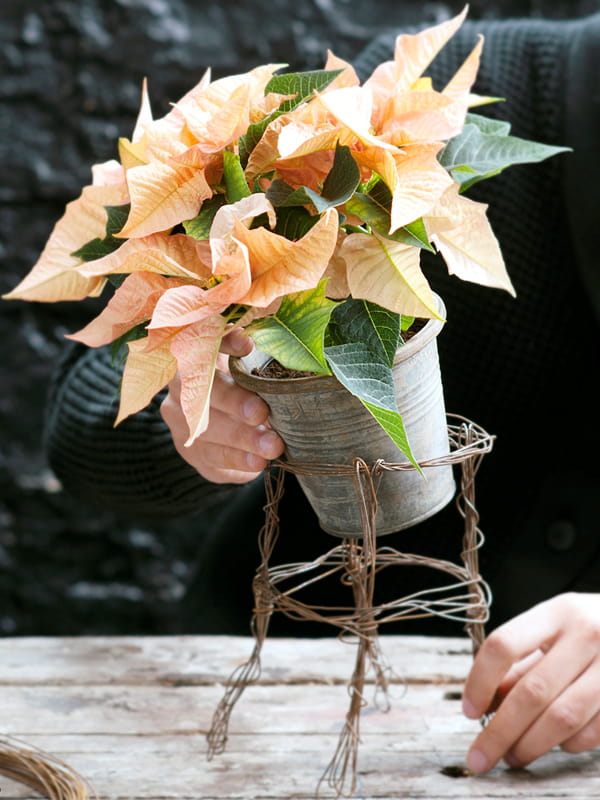Maintenant que l'armature du support est terminée, placer la plante d'intérieur, ici un poinsettia, et vérifier que les pieds sont assez solides pour la soutenir. Astuce déco : pour apporter de la légèreté, réaliser plusieurs portes-pot en variant les hauteurs peut s'avérer très judicieux.