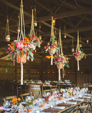 Ici, les pivoines se déploient dans des pots de fleurs suspendus au-dessus des tables en bois brut, mais aussi avec discrétion dans les petits pots en centre de table : un atout botanique et romantique pour ce mariage authentique.