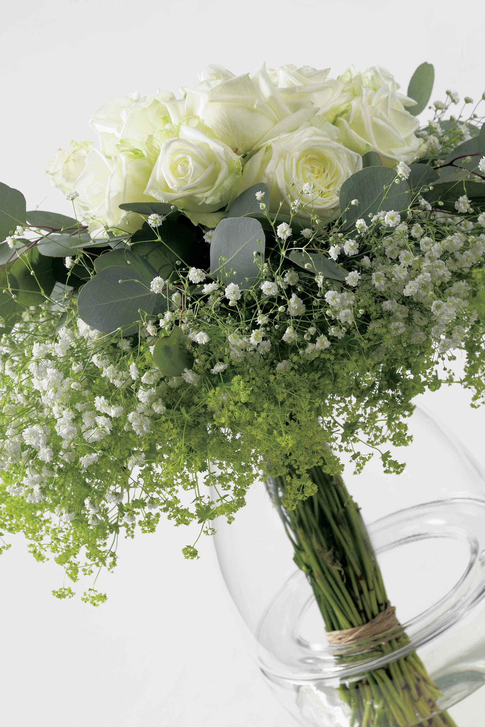 Venu de Tasmanie, l'eucalyptus gunnii est un arbre exotique aux 700 espèces et au feuillage persistant et odorant Un tel nombre implique donc des apparences très diverses selon les espèces : de quelques mètres de hauteur jusqu'à 90 mètres, avec un ou plusieurs troncs et avec une variété très importante d'écorce. Chacune des espèces a son charme et ses particularités, mais nul doute que l'eucalyptus gunnii est celui qui vous tapera le plus facilement dans l'œil. Et vous n'avez d'ailleurs pas dû passer à côté. En photo : Les feuilles d'eucalyptus, rondes lorsque l'arbre est jeune puis plus longues et pendantes, ont une couleur bleu vert qui se marie à merveille aux bouquets champêtres ou à ceux plus sophistiqués. Ici avec de la gypsophile et des roses blanches, l'eucalyptus livre toute sa beauté.