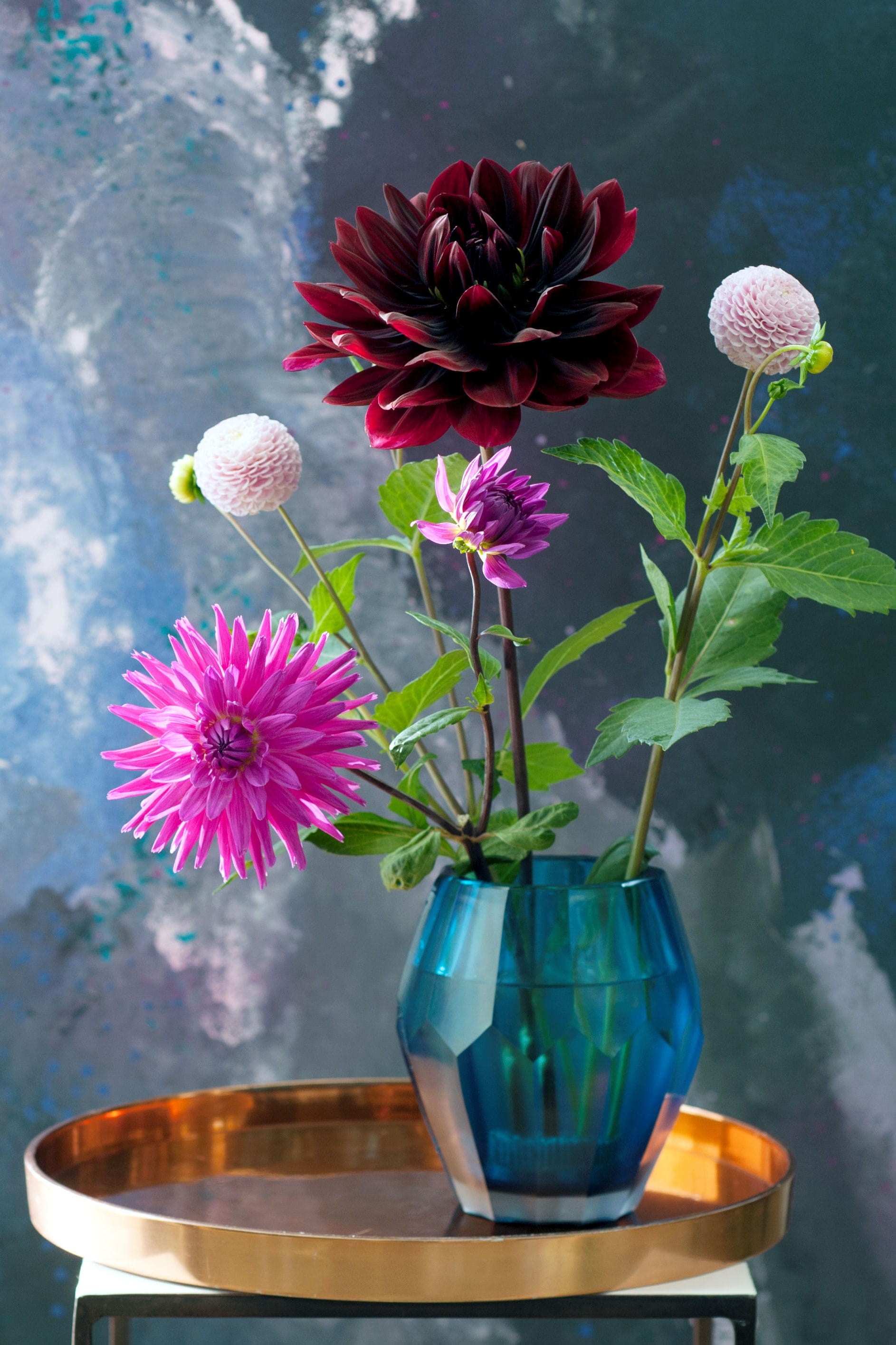Si vous voulez associer plusieurs variétés de dahlias dans un même bouquet (ici, type pompon, semi-cactus et camélia), veillez à respecter un camaïeu de teintes pour un effet harmonieux. Ici, une déclinaison autour du rose, du plus pâle au plus foncé, presque bordeaux.