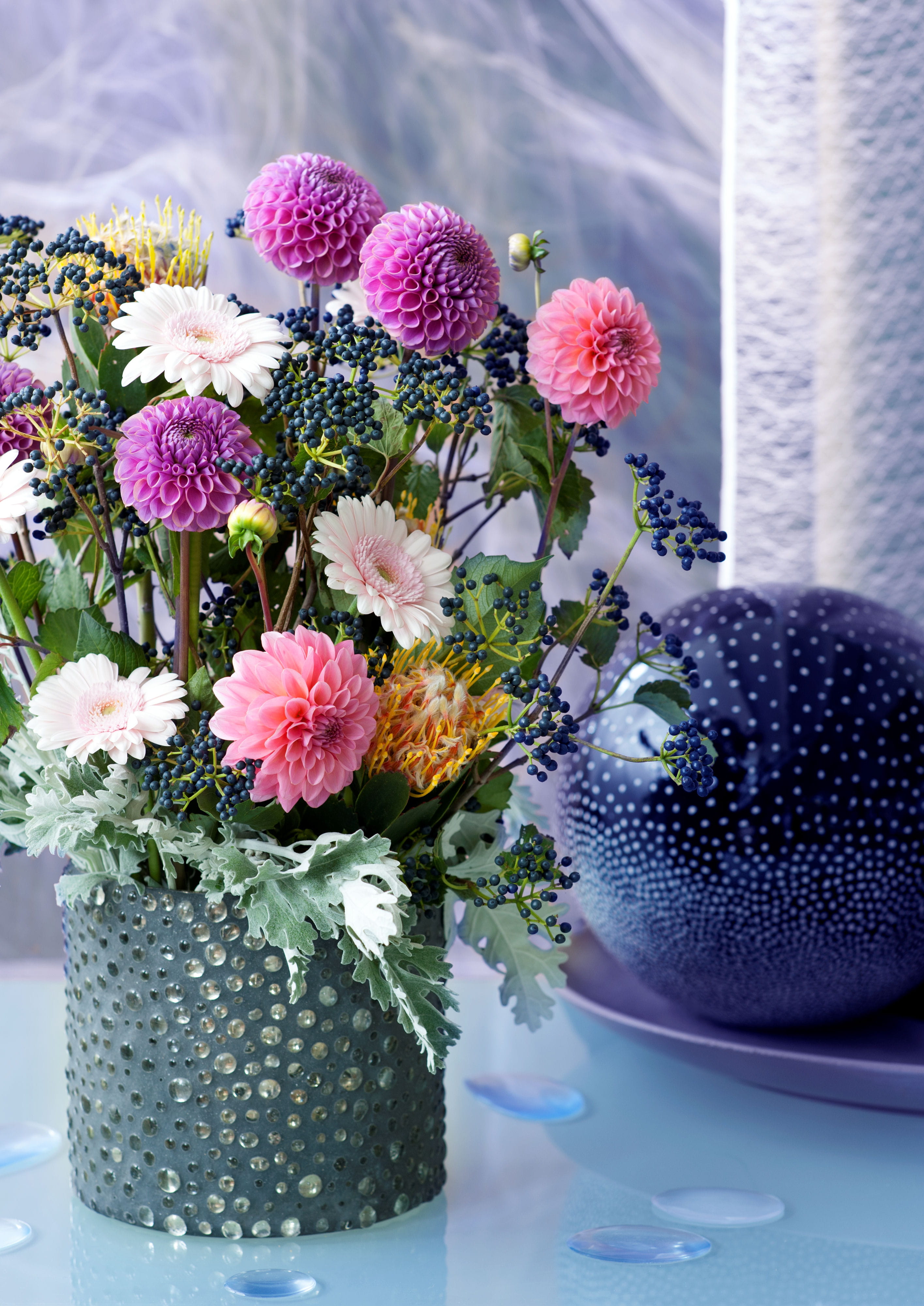 Il existe de nombreuses formes de dahlias, dont certaines très décoratives comme celles-ci toutes en rondeur. Il s'agit de variétés balle ou pompon. Ici, elles sont associées à d'autres dahlias jaune-orangé de type lacinée, aux pétale dentelés, et à quelques baies noires pour un effet coloré et automnal.