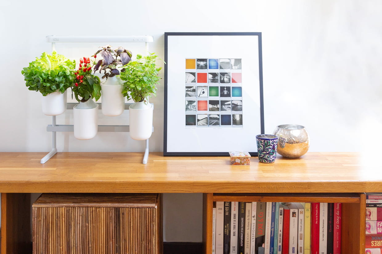 Potager d'intérieur évolutif Modulo en ABS, grille et système d'accroche murale en acier, capsules en plastique végétal compostable, L 46 x P 15,5 x H 47,5 cm, livraison gratuite : 145,95 euros avec 4 capsules sur le site de marque