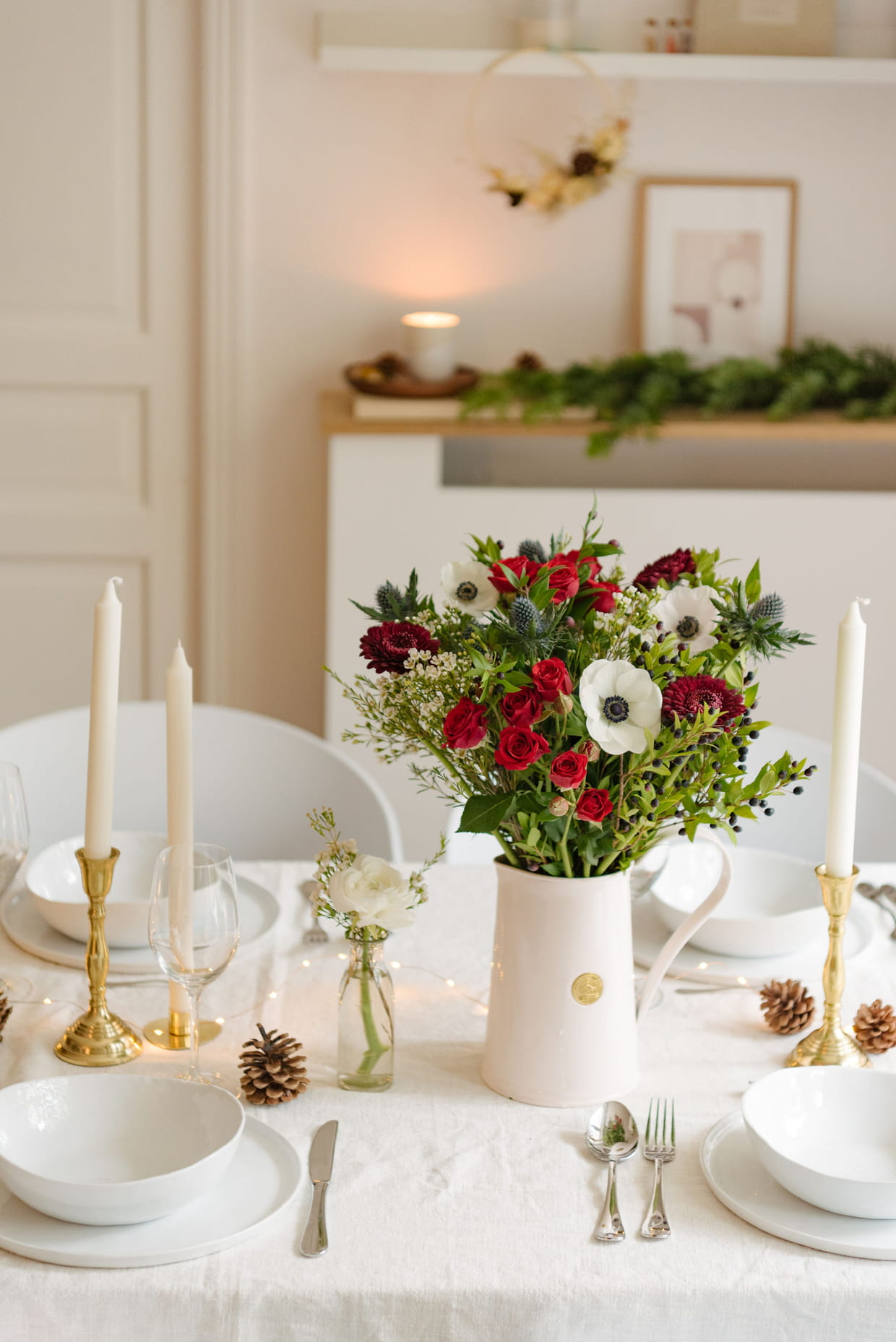 Le bouquet Nunavut de Bergamotte se compose d'anémones blanches, de chardons, de gerberas, de roses Pushkin et de wax blanc dans un feuillage de myrte. 39,90 euros chez Bergamotte