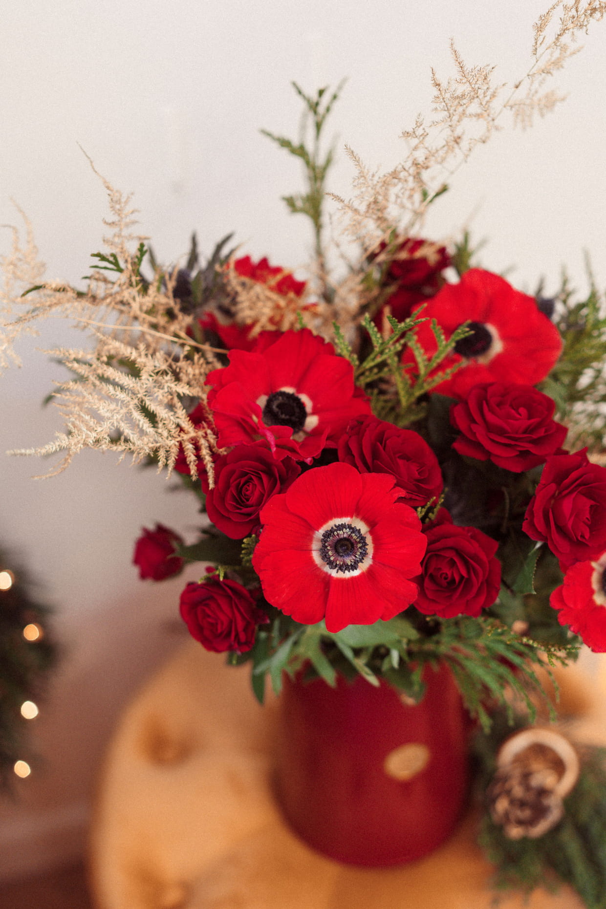 Imaginé avec Daphné du blog Mode & The City, ce bouquet se compose d'anémones rouges, d'asparagus dorés, de chardon et de roses Pushkin dans un feuillage de thuya. 45,90 euros chez Bergamotte