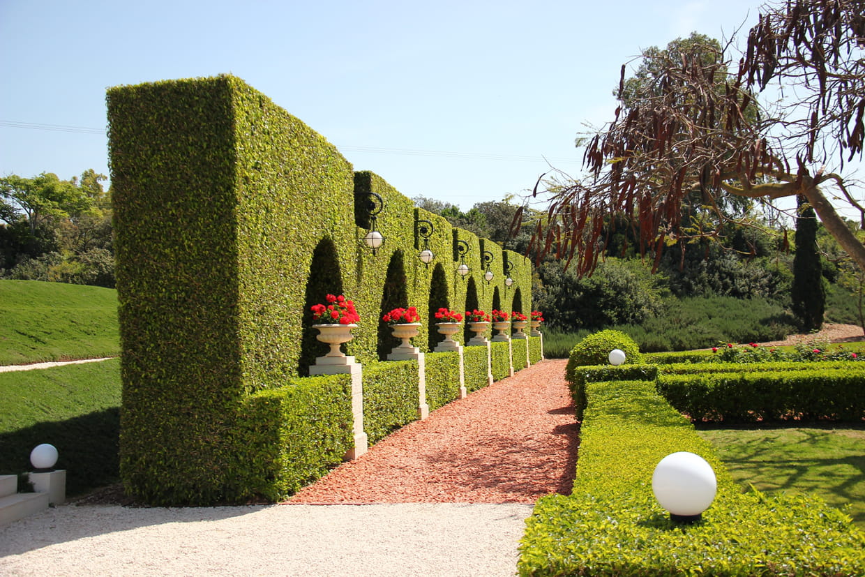 Idéales pour délimiter différents espaces au jardin, l'art topiaire façonne ici des haies séparatives taillées de près. Au centre, une ouverture a permis d'inviter des colonnes décoratives surmontées de pots de fleurs.