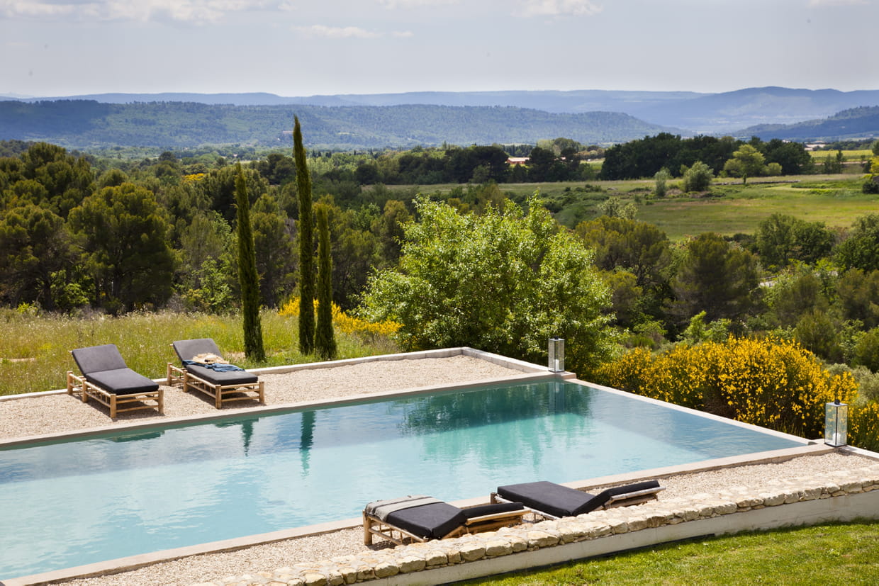 Dans ce vaste jardin, les trois cyprès permettent de modifier la longue perspective depuis la piscine tout en délimitant visuellement cet espace.
