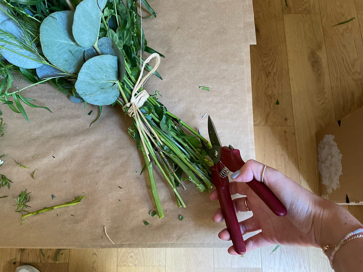 Maintenant que le bouquet est bien maintenu, vous pouvez procéder au taillage des tiges. Le but étant qu'elles soient toutes à la même hauteur et qu'elles puissent facilement être glissées dans un vase.