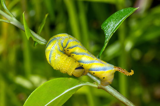 Jaune fluo, striée de bleu, armée d'une corne et longue comme un doigt, cette chenille impressionne autant qu'elle déstabilise. À première vue, elle fascine par ses couleurs éclatantes. Mais derrière cette allure presque exotique, mieux vaut rester sur ses gardes.