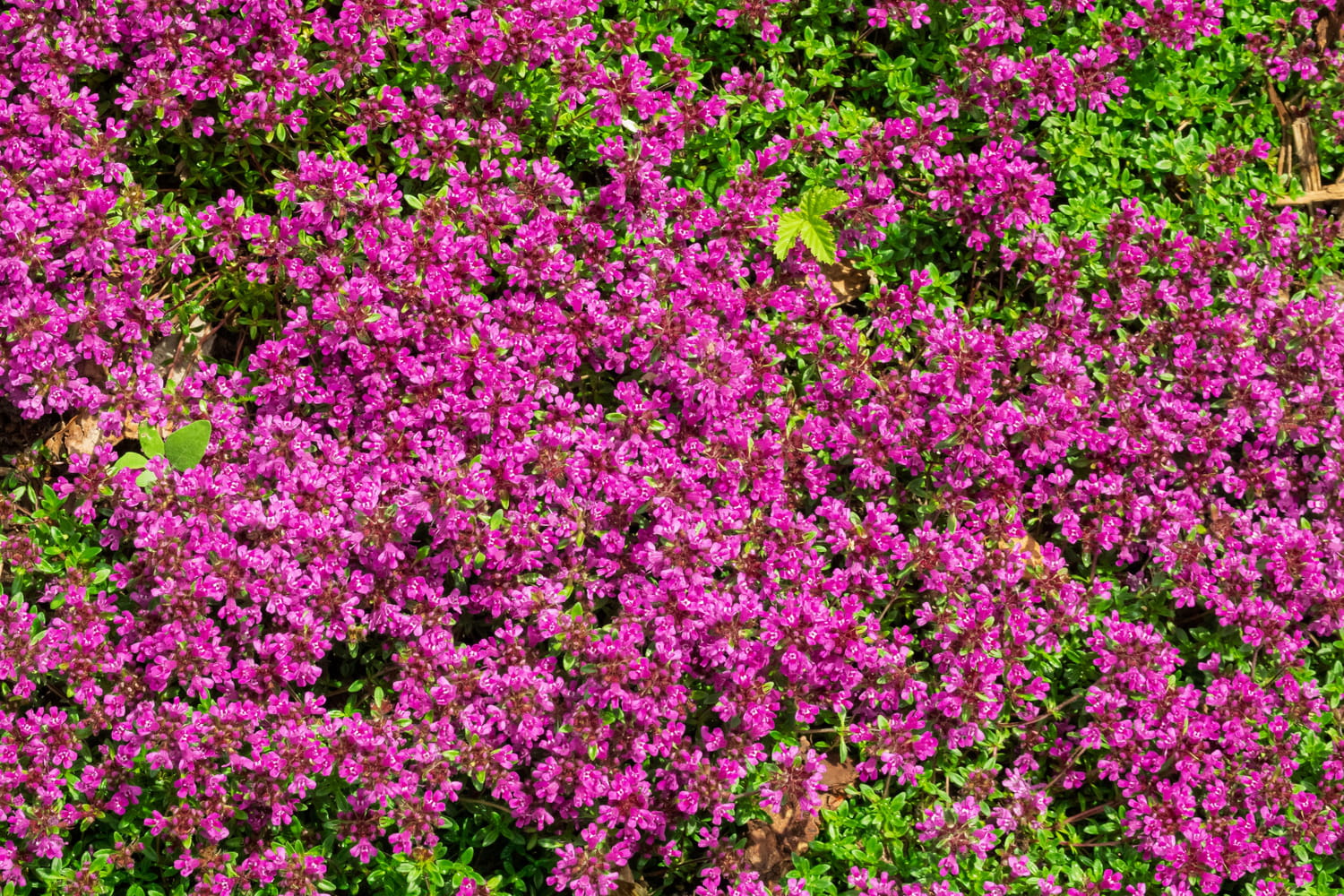 Facile à vivre et visuellement spectaculaire, cette plante coche toutes les cases. En pleine saison, elle se couvre d'une multitude de petites fleurs serrées, dans des tons rouge rosé à pourpre, jusqu'à former un tapis compact qui capte la lumière. Résistante à la chaleur, au vent et au froid, elle pousse là où peu de plantes tiennent : sols secs, terrains pauvres ou rocailles. Une fois bien installée, elle ne demande presque rien, s'étend naturellement et reste décorative tout au long de l'année grâce à son feuillage vert gris persistant. On peut l'utiliser pour habiller une bordure, combler les interstices d'un dallage ou stabiliser un talus. Cette plante qui vaut la peine qu'on la choisisse, c'est le thym sauvage.